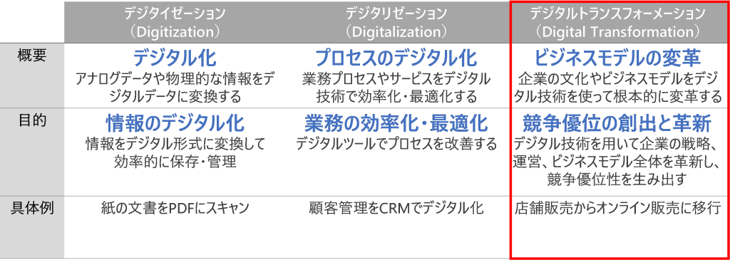 一方で単なるデジタル化(デジタイゼーションやデジタリゼーション)と混同されることも多いため、言葉だけが先行しDXの本質、すなわち競争優位性を確立するという本来の目的が理解されていない場面も見受けられます。