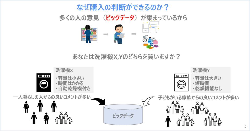 例えば、一人暮らしの方からの良いコメントが多い「洗濯機X(容量小、時間がかかるが自動乾燥機付き)」と、子どもがいる家族からの良いコメントが多い「洗濯機Y(容量大、短時間だが乾燥機なし)」があった場合、利用者は自身のニーズ(例:一人暮らしならX)に基づいて選択できます。ビッグデータによりユーザーは自身の状況に合致した製品を選び安心して購入できるようになったのです。