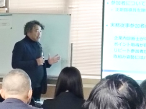 副指導員から指導員へ進む過程や、実務従事の進め方に関する実体験をお話いただきました。会場・設備面への配慮、事前調査や診断の方向性検討、参加者との接し方など、実践的な工夫についてご説明いただきました。